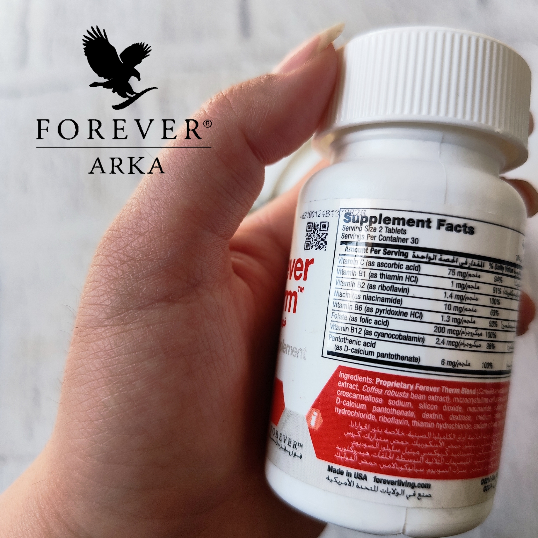 ترکیبات اصلی: عصارهی (برگ) چای سبز، عصارهی دانههای گوآرانا، دانههای قهوهی سبز (Coffearobusta) ،کتان تمشکها Raspberry Ketones)) ، ویتامین ث ، ب۱ ب۲ ب۶ ب۱۲ ، نیاسین ، فولیک اسید ، اسید پاناتوتنیک و مخلوط اختصاصی فوراور ترم